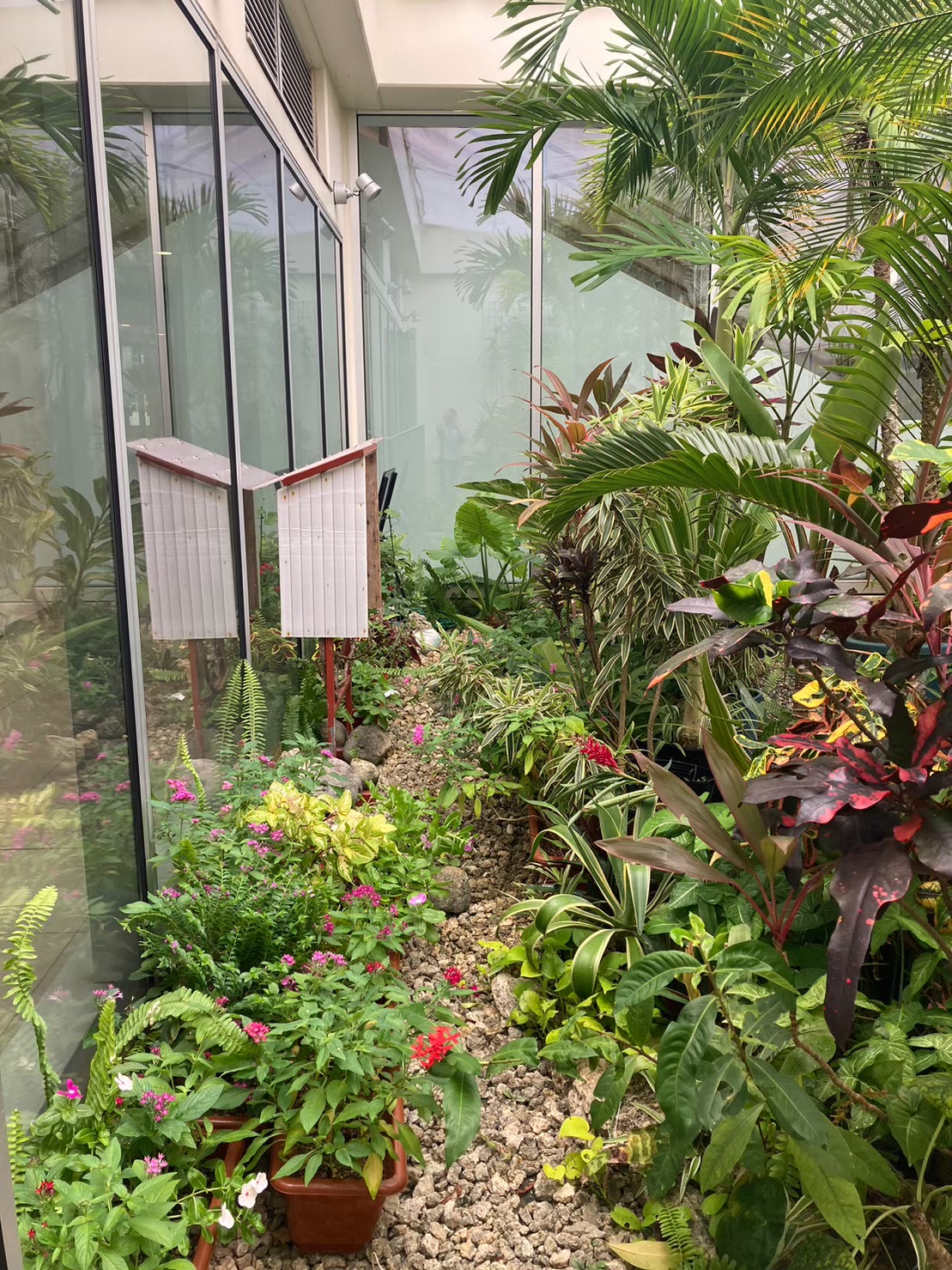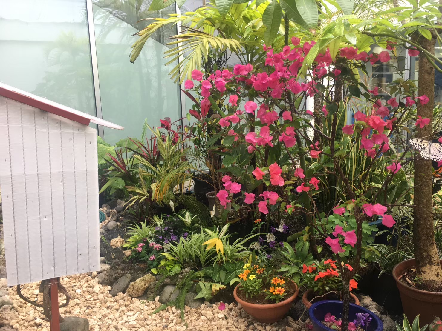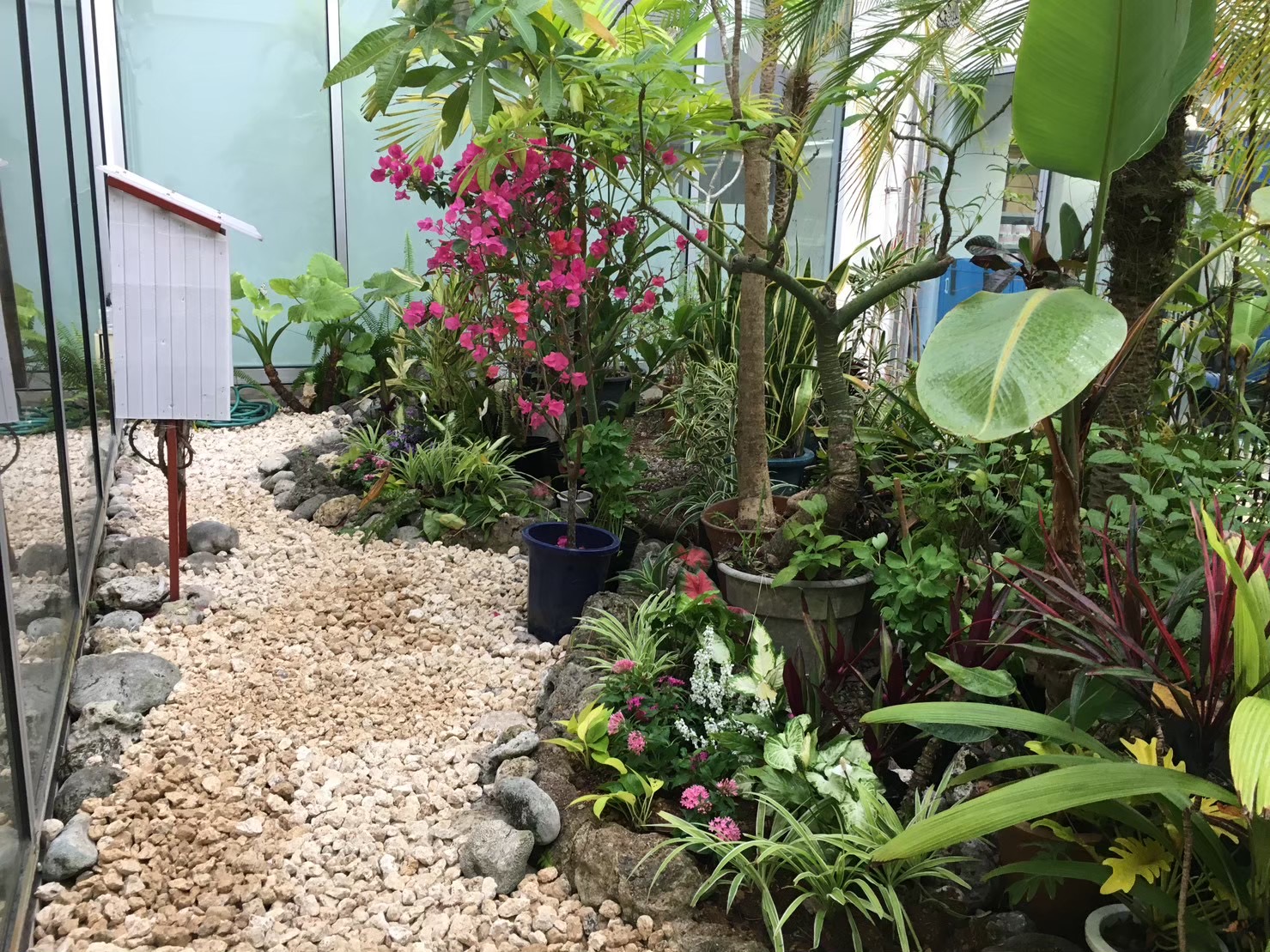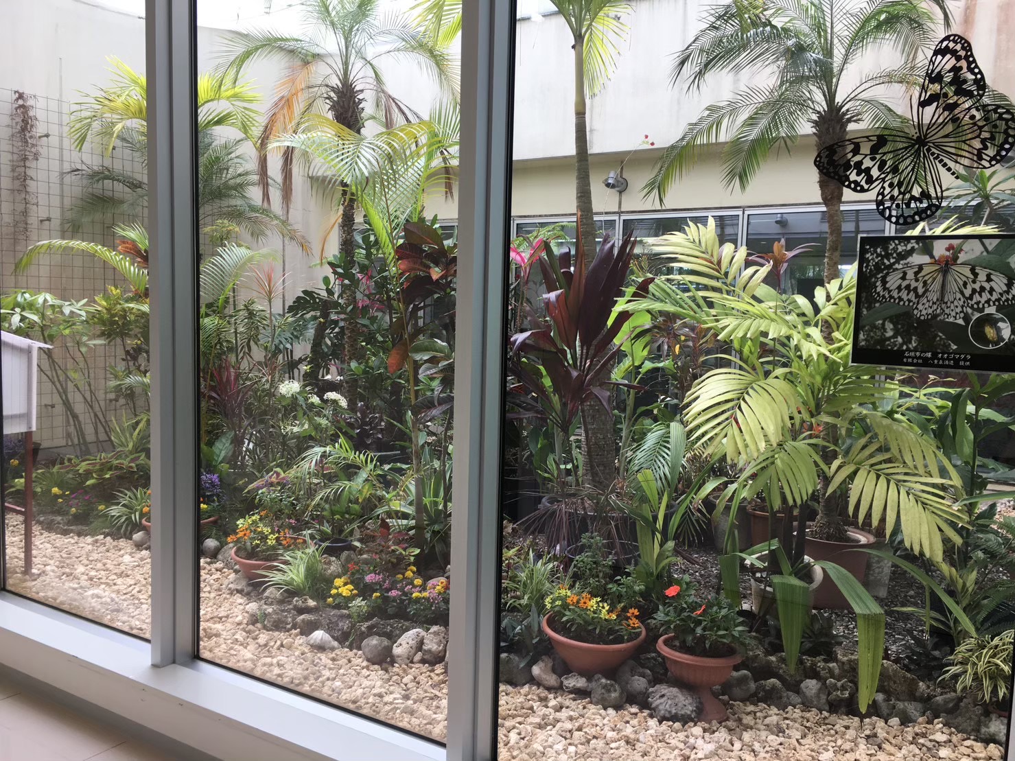 植栽デザインにおいては、オオタニワタリや多様なクロトンなど八重山を代表する植物を配植し、彩り豊かな空間を表現、オオゴマダラと植物の解説パネルも設置しました。
